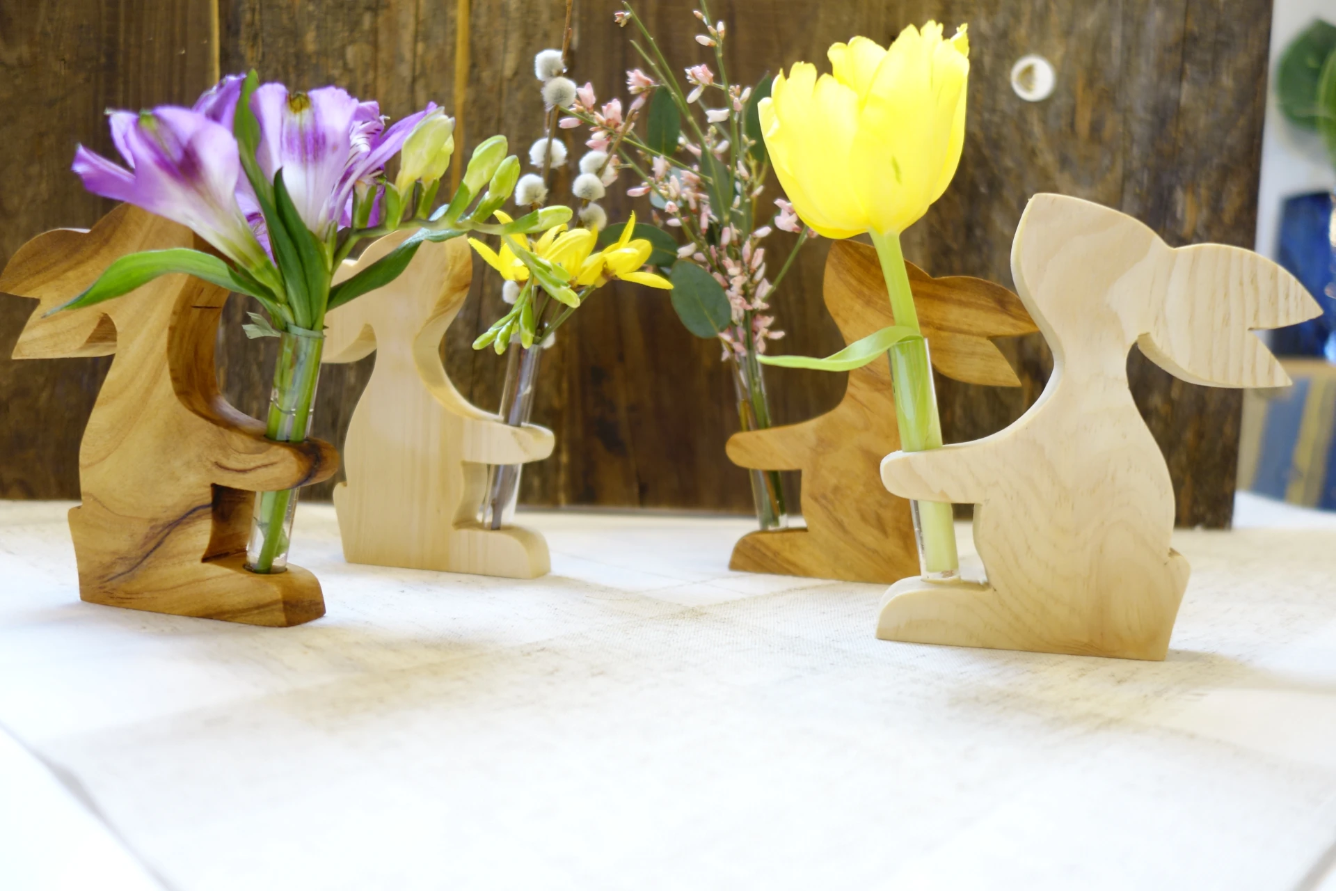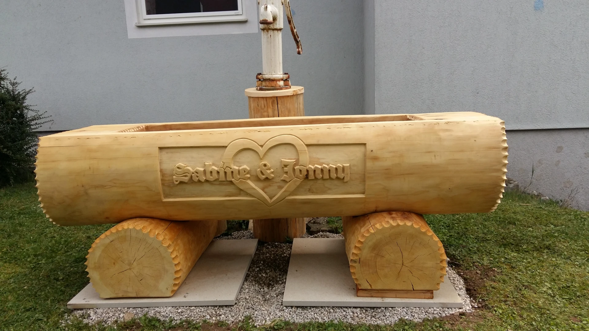 …mit lebensgroßen, motorsäge-geschnitzten Skulpturen oder frechen Blumenbehältern
